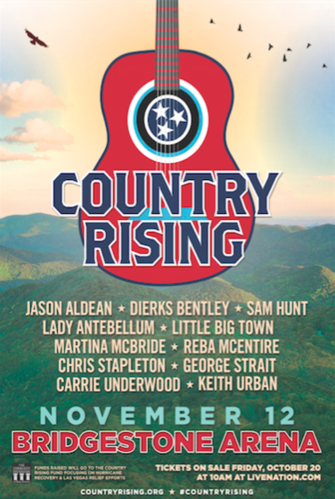 Jason Aldean, Dierks Bentley, Sam Hunt, Lady Antebellum, Little Big Town, Martina McBride, Reba McEntire, Jon Pardi, Chris Stapleton, George Strait and Keith Urban played a star-studded, sold-out fundrasing show at Nashville’s Bridgestone Arena last night (11/12). Proceeds from COUNTRY RISING, presented by Hilton and Dollar General, are going towards the Country Rising Fund of The Community Foundation of Middle Tennessee, which was established to support charitable initiatives to help victims of the September 2017 hurricanes — Hurricanes Harvey, Irma, Jose and Maria. Additionally, the fund will also envelop victims of the recent shooting in Las Vegas.For more information, visit: www.CountryRising.org.