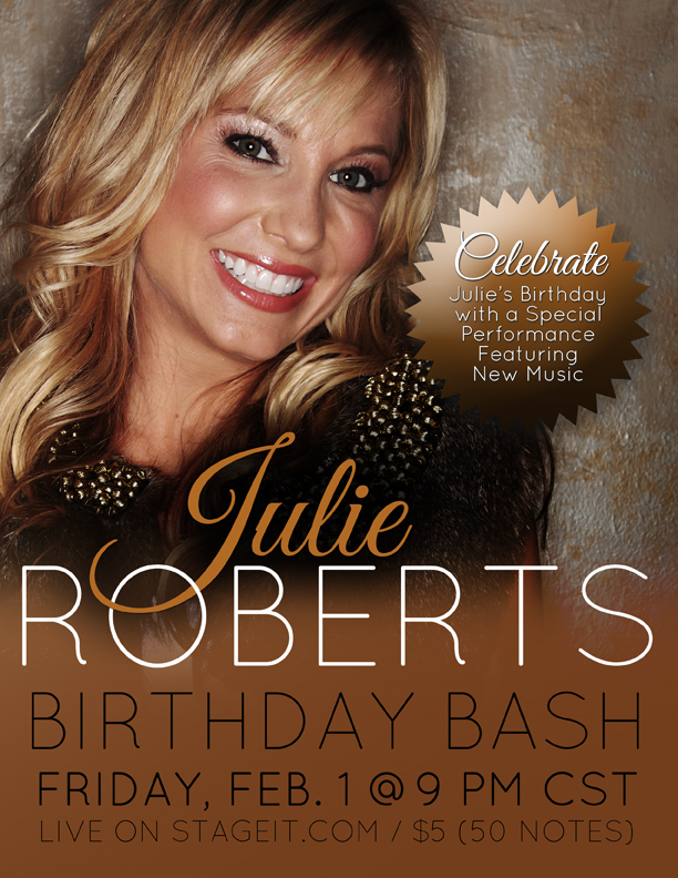 Country singer/songwriter Julie Roberts will celebrate her birthday Friday, February 1 with her fans around the world through a special, intimate concert setting broadcast live on StageIt.com.
